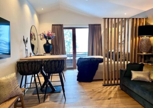 Ontdek de perfecte combinatie van stijl, comfort en ultiem genieten in de luxe Loft-Style Appartement De Suite in Kónigsleiten.Met een hoog plafond dat een gevoel van ruimtelijkheid creëert, onderscheidt dit appartement zich door zijn moderne uitstraling, luxe afwerking en hoogwaardige materialen. Deze hippe loft biedt een woon-leef-slaapruimte in één, met een comfortabele (slaap)bank en een luxe tweepersoonsboxspring bed. Het slaapgedeelte is middels een robuuste houten roomdivider af te scheiden voor extra privacy. De lekkerste maaltijden creëer je in de moderne keuken, volledig uitgerust met hoogwaardige apparatuur en stijlvolle inrichting. Vanuit de studio stap je het zonnige balkon op, waar je van ’s ochtends tot laat kan genieten van de zon. Gelegen op de bovenste etage, biedt het adembenemende uitzichten op de bergen. En voor ontspanning na een dag vol avontuur in de bergen kun je perfect op het balkon met een goed boek of drankje van de zonsondergang genieten of kijk je een film op de smart tv voorzien van Sonos audiosysteem en Chromecast. Dat wordt op en top genieten De Suite!
