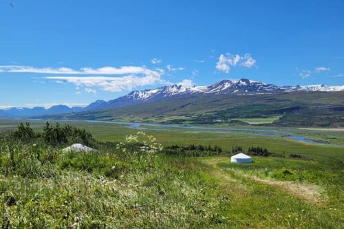 Een echt unieke overnachtingsmogelijkheid is een verblijf in een Mongolian yurt midden in de natuur. De yurts liggen op een heuvel met fantastisch uitzicht over de bergen en het fjord, op slechts 6 minuten rijden van Akureyri. Er zijn 2 yurts beschikbaar, een voor 2-3 personen (20 m2, doorsnee van 5 meter) met een 2- persoonsbed en een 1-persoonsbed en een grotere yurt voor max. 4-5 personen (30 m2) met een doorsnee van 6 meter met een 2-persoonsbed en twee 1- persoonsbedden. Er kan evt. nog een kinderbed bijgeplaatst worden. Er is een klein toiletgebouwtje met een wastafel en de gasten kunnen gebruik maken van een gasbarbecue. Vanaf de parkeerplaats is het ca. 5 minuten lopen naar de yurts. De yurts beschikken over wollen vloerkleden en een houtkachel, waarmee je het ook `s winters lekker warm kan stoken en waarop je een kop koffie/thee kunt maken of een IJslands pannenkoekje kan bakken. Het ontbijt is inbegrepen en wordt voor de gasten klaargezet in de yurt. Bedlinnen, handdoeken, haardhout en eindschoonmaak zijn inbegrepen. De gasten kunnen gratis gebruik maken van het geothermische Hrafnagil zwembad (10 minuten rijden), waar je ook kan douchen. Ook in de winter kun je slapen in de yurts en, als je wil, zelfs tot de deur skieen. De yurts waren ook te zien in het TV programma `Kerst met de familie Meiland` in 2024. Akureyri is de grootste stad van het noorden, waar je restaurants, winkels en supermarkten vindt. Een aanrader is de Forest Lagoon Geothermal Baths. Je kunt ook het gebied rondom het Myvatn meer verkennen, een actief vulkanisch gebied met pseudokraters, de Krafka vulkaan en de explosiekrater Hverfell. Namaskard is een fascinerende plek, met pruttelende modderpoelen en fluitende stoombronnen. Ski- en snowboard liefhebbers kunnen terecht in het Hlidarfjall skigebied op 10 minuten rijden. Akureyri 5 km, Myvatn 78 km, Dettifoss waterval 132 km, Husavik 75 km.